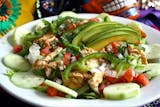 Chipotle dressing, chicken, cilantro, onions, tortilla chips, black beans, guacamole and side of fried.